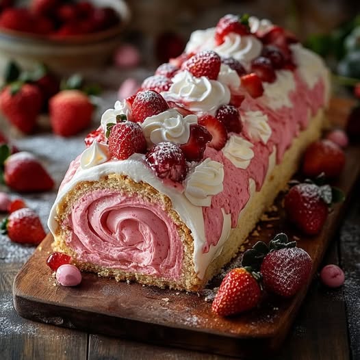 Roll up the genoisie and top with a generous layer of strawberry mousse.